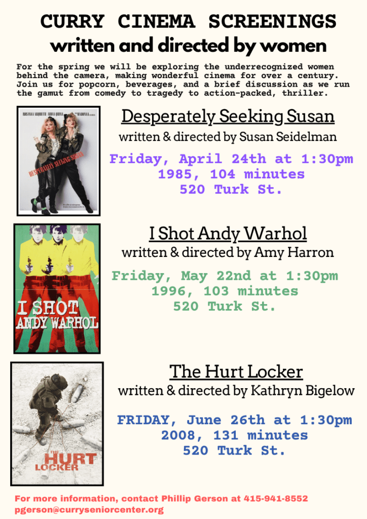 Curry’s Cinema screenings from April thru May will feature movies written and directed by women. Don’t miss these critically acclaimed movies made over the years. For more information, contact Phillip Gerson at 415-941-8552 or pgerson@curryseniorcenter.org