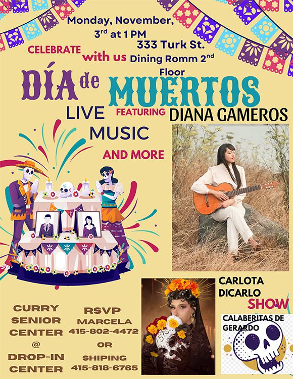 Please join Curry Senior Center’s Día de los Muertos celebration in the Drop-in Center at 333 Turk St. The event will feature live singing performances and cultural festivities honoring this meaningful tradition. Curry Staff will be creating culturally inspired altars and the most creative altar will be recognized at teh event.